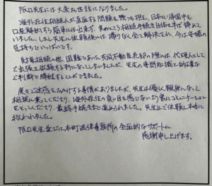 度々ご迷惑をおかけする事情がありましたが、先生は優しく親身になって相談に乗ってくださり、海外在住の負い目を感じないよう密にコミュニケーションをとってくださり、最終手続きまで進められました。先生にご依頼し本当に救われました。